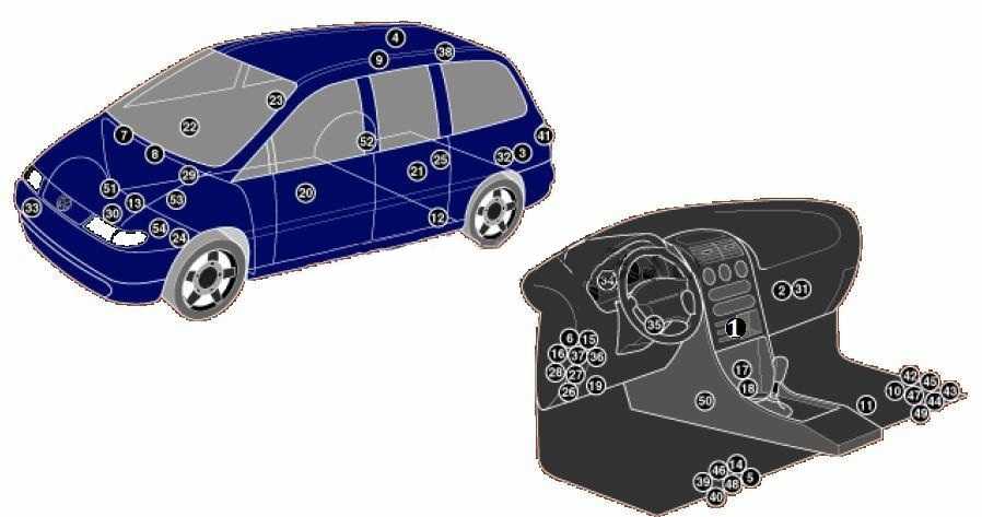 | 48 | Датчик бокового удара со стороны водителя — под сиденьем водителя |