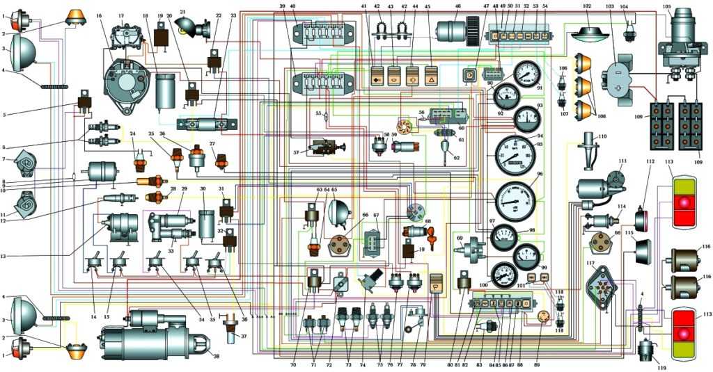Схема электрооборудования автомобиля ГАЗ-53А:1 – фара; 2 – передний габаритный фонарь; 3 – боковой повторитель указателя поворотов; 4 – транзисторный коммутатор; 5 – катушка зажигания; 6 – прерыватель-распределитель: 7 – соединительная панель; 8 – подавительный резистор; 9 – свеча зажигания; 10 – генератор; 11 – реле-регулятор; 12 – датчик термометра; 13 – датчик сигнализатора аварийной температуры охлаждающей жидкости; 14 – датчик сигнализатора аварийного давления масла; 15 – дополнительные резисторы; 16 – подкапотная лампа; 17 – датчик манометра; 18 – включатель зажигания; 19 – переключатель электродвигателя стеклоочистителя; 20 – электродвигатель стеклоочистителя; 21 – электродвигатель отопителя; 22 – переключатель; 23 – лампы освещения приборов; 24 – указатель манометра; 25 – амперметр; 26 – лампа аварийного давления масла; 27 – контрольная лампа дальнего света фар; 28 – лампа сигнализатора аварийной температуры охлаждающей жидкости в двигателе; 29 – указатель уровня топлива; 30 – указатель термометра; 31 – контрольная лампа указателей поворота; 32 – предохранитель; 33 – плафон; 34 – выключатель плафона; 35 – переключатель датчиков уровня топлива; 36 – штепсельная розетка переносной лампы; 37 – датчик уровня топлива; 38 – датчик уровня топлива в дополнительном баке; 39 – прерыватель указателей попорота; 40 – выключатель стоп-сигнала; 41 – центральный переключатель света; 42 – аккумуляторная батарея; 43 – дополнительное реле стартера; 44 – кнопка сигнала; 45 – звуковой сигнал; 46 – стартер; 47 – соединитель проводов; 48 – ножной переключатель света; 49 – переключатель указателей поворота; 50 – штепсельная розетка прицепа; 51 – задний габаритный фонарь.