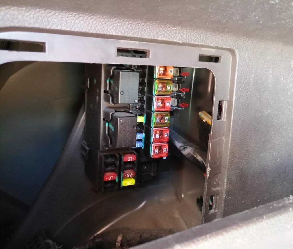 В багажнике автомобиля монтажный блок расположен на левой боковине за крышкой. Для доступа нужно снять крышку.