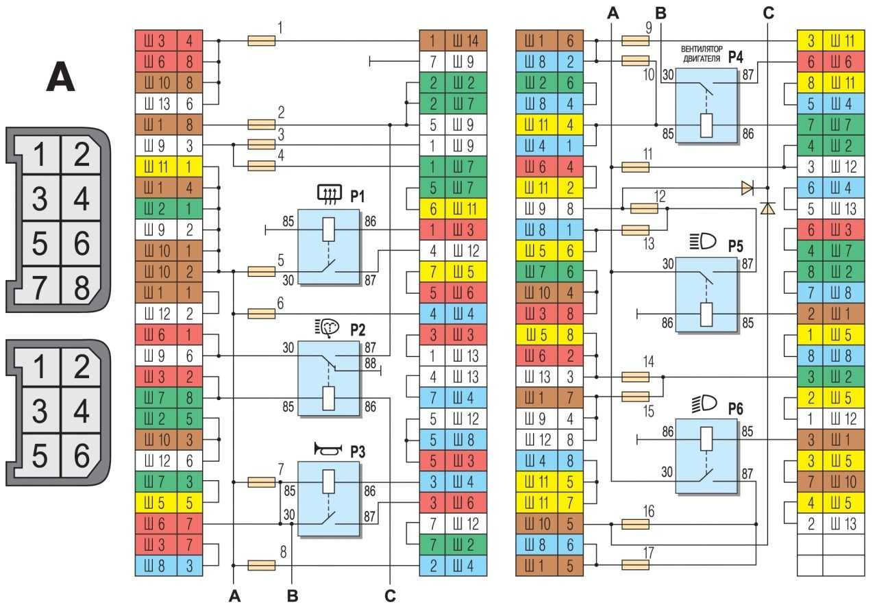 P1 — реле включения обогрева заднего стекла; P2 — реле включения очистителей и омывателей фар; PЗ — реле включения звуковых сигналов; P4 — реле включения электродвигателя вентилятора системы охлаждения двигателя; P5 — реле включения дальнего света фар; P6 — реле включения ближнего света фар; А — порядок условной нумерации штекеров в колодках монтажного блока. Наружная цифра с буквой «Ш» в обозначении штекера — номер колодки, а внутренняя цифра — условный номер штекера. Штекеры колодок без цветной маркировки условно показаны коричневым цветом