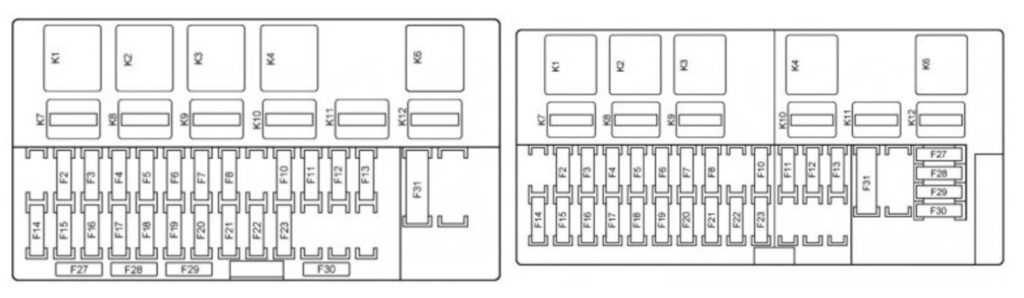 Салонный блок является основным. Именно от него по кузову расходятся все остальные потребители. В зависимости от комплектации, плавкие вставки и реле могут иметь разное назначение. Более подробно все расписано в таблицах.