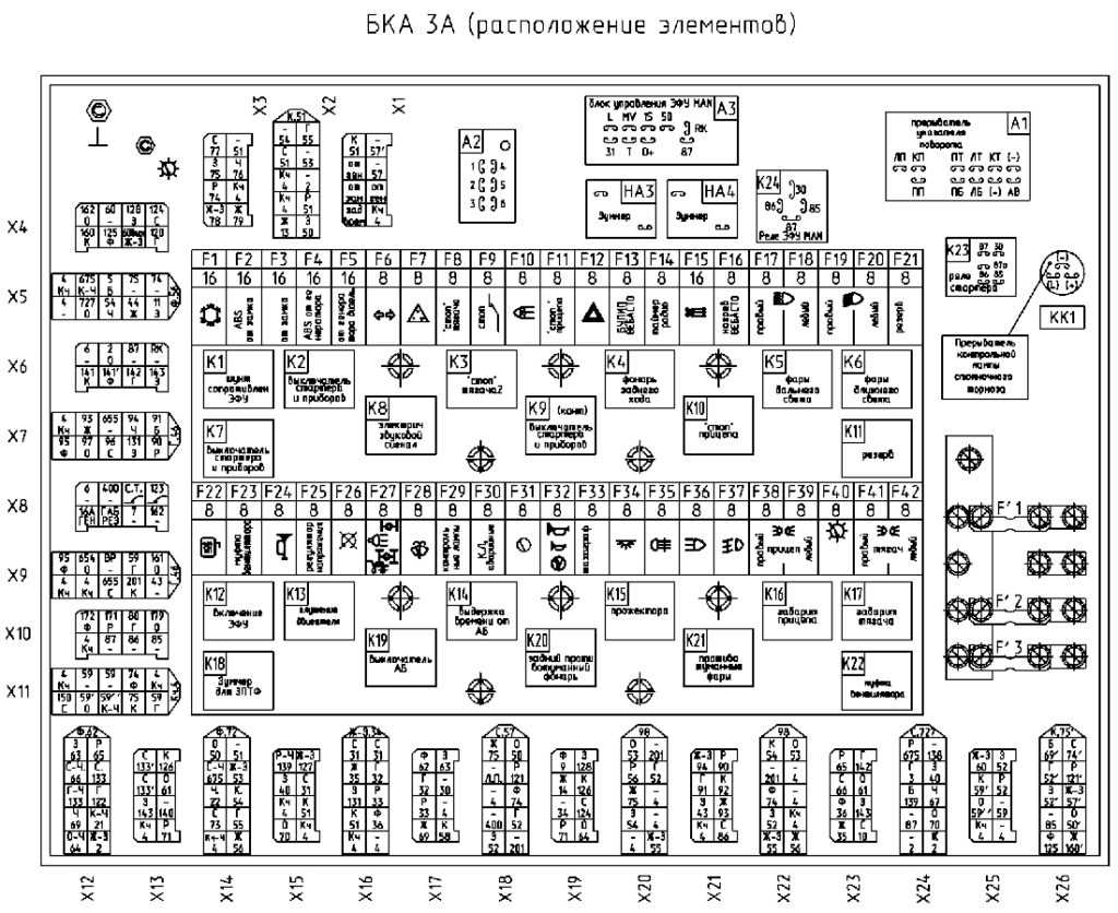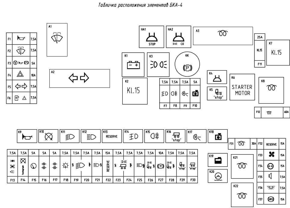 • 127 — спидометр, показатель напряжения, контрольное устройство регистрации скорости; • Предохранитель, отвечающий за звуковые сигналы; • 57 — тормозные сигналы; • 90 — работа стеклоомывателя и стеклоочистителя; • 120 — колесная и осевая блокировки, фонарь освещения сцепки, фонари заднего хода; • 162 — подогрев зеркал; • Обеспечение питания бортсистемы контроля; • P51 — отвечает за подсветку приборов; • 55 — предохранитель противотуманных фонарей; • Кч.52 — предохранитель на габаритные огни с правой стороны; • Г.52 — предохранитель на габаритные огни с левой стороны; • Ф.56 — фонарь слева (свет ближний); • Ж.56 — фонарь справа (свет ближний); • 53 — предохранитель на дополнительные фонари дальнего света; • К.54 — фонарь справа (свет дальний); • З.54 — фонарь слева (свет дальний); • Г.80 — предохранитель на отопительный вентилятор; • Ж.79 — работа аварийной сигнализации; • К.78 — предохранитель, отвечающий за указатели поворота; • С.31 — предохранительное устройство на указатели головного щитка и лампы контроля; • 50 — предохранитель на противотуманные фонари (задние).