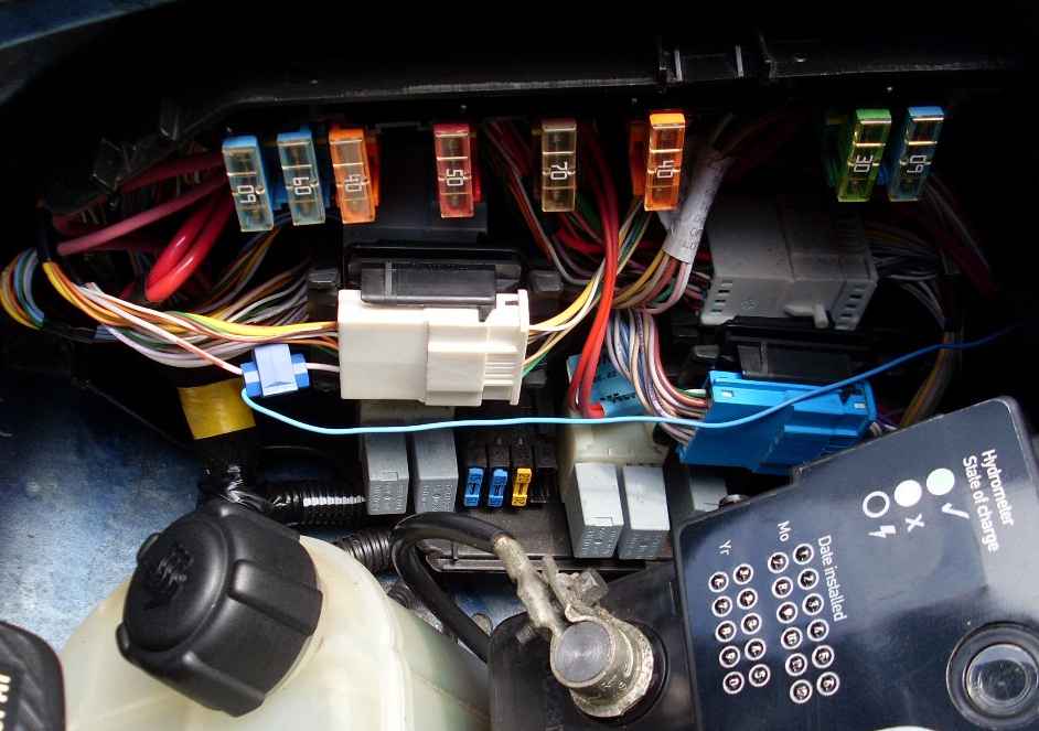 Для доступа к блоку предохранителей, расположенному под обивкой левого крыла в багажном отделении, отогните боковую обивку с левой стороны. См. «Аккумуляторная батарея 12 вольт: Замена АКБ». Далее отведите в сторону электропроводку блока и откройте сам блок.
