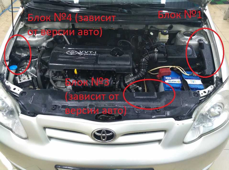 Центральный блок находится под панелью приборов автомобиля. Он располагается на стенке. Его закрывают легко снимаемой декоративной панелью. Второй блок располагают в моторном отсеке. Для моделей Тойота, у которых установлен кондиционер, его расположение несколько иное, он находится рядом с аккумуляторной батареей.