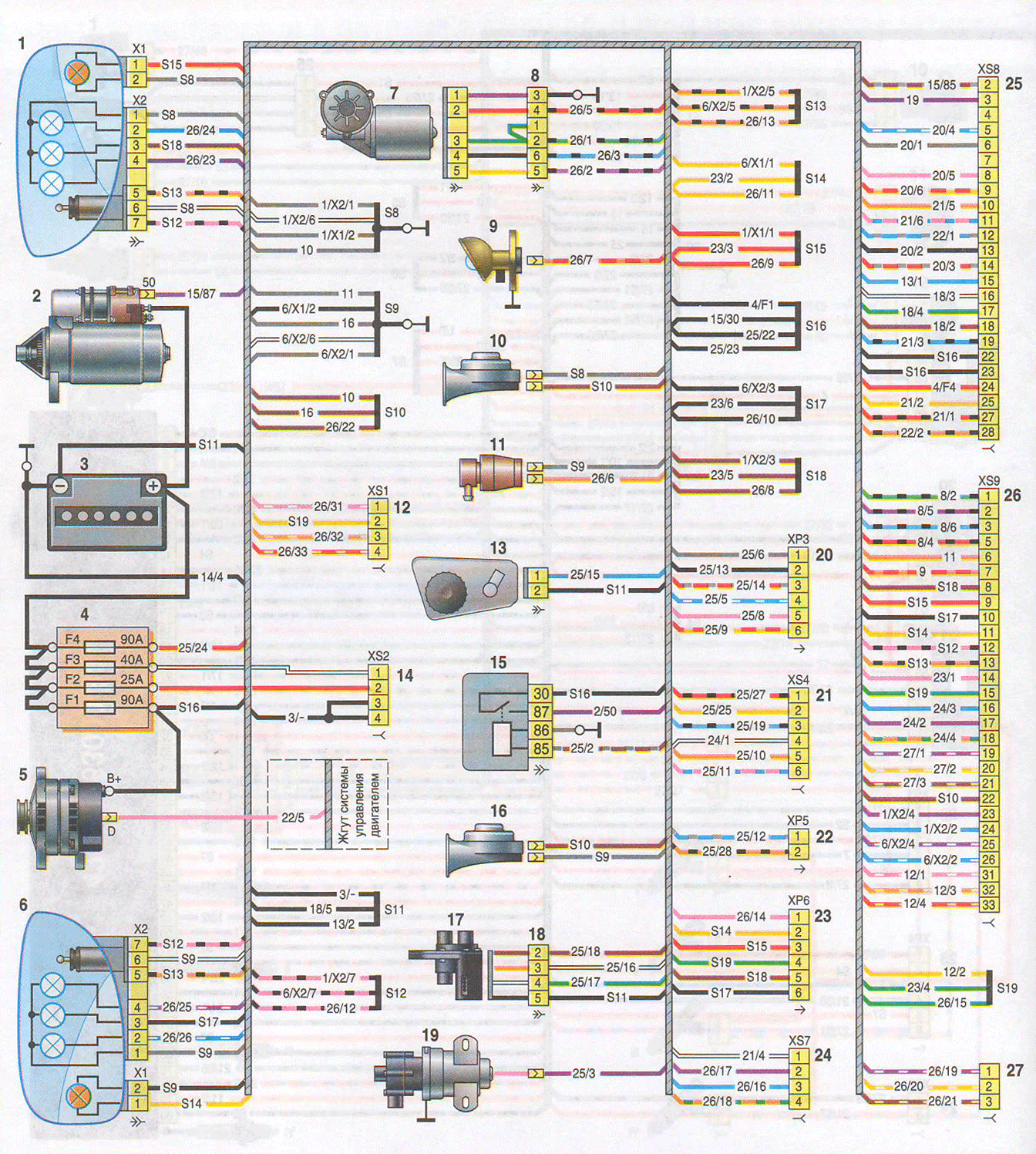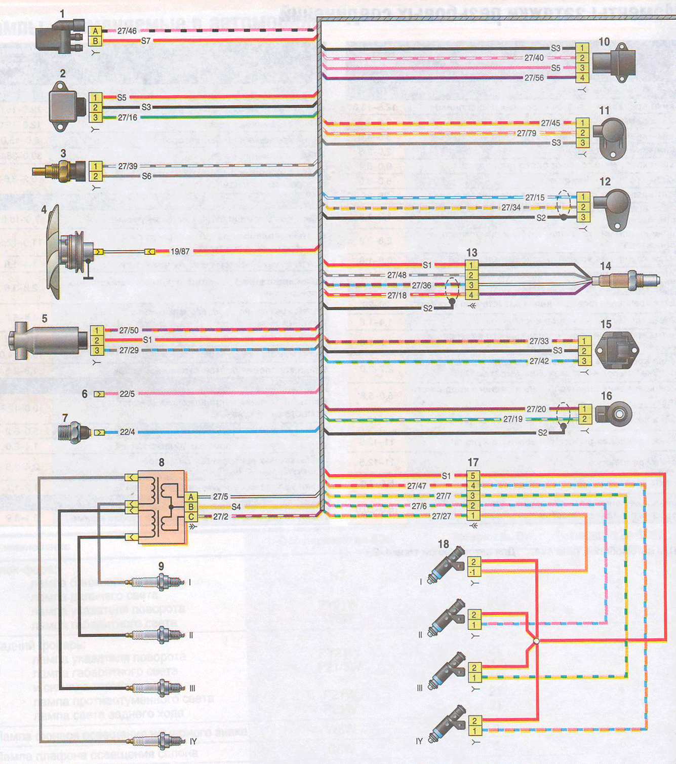| 1 Клапан продувки адсорбера 2 Датчик положения дроссельной заслонки 3 Датчик температуры охлаждающей жидкости 4 Муфта вентилятора 5 Регулятор холостого хода 6 Клемма D гератора 7 Датчик сигнализатора аварийного давления масла 8 Катушка зажигания 9 Свечи зажигания | 10 Датчик абсолютного давления и температуры воздуха на впуске 11 Датчик фаз 12 Датчик положения коленчатого вала 13 Колодка соединения со жгутом проводов управляющего датчика концентрации кислорода 14 Управляющий датчик концентрации кислорода 15 Датчик неровной дороги 16 Датчик детонации 17 Колодка соединения со жгутом проводов форсунок 18 Форсунки | 19 Реле муфты вентилятора 20 Главное реле 21 Реле топливного насоса 23, 24 Колодки соединения с передним жгутом проводов 25 Колодка соединения со жгутом проводов диагностического датчика концентрации кислорода 26 Диагностический датчик концентрации кислорода 27 электронный блок управления двигателем (контроллер) МИКАС М10.3 |
