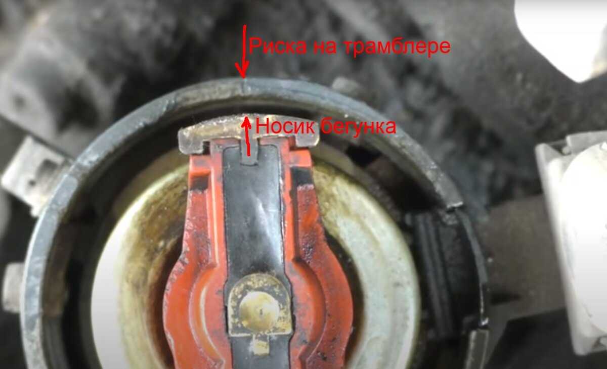 - Затем, вращая корпус трамблёра по часовой стрелке, совмещаем центр бегунка с риской на корпусе;