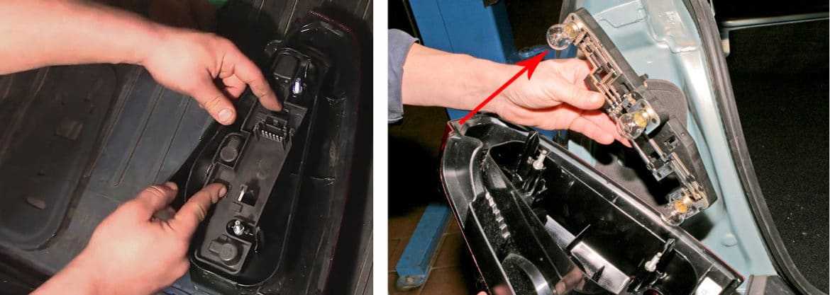 - Достать задний фонарь и отщелкнуть панель крепления лампочек.