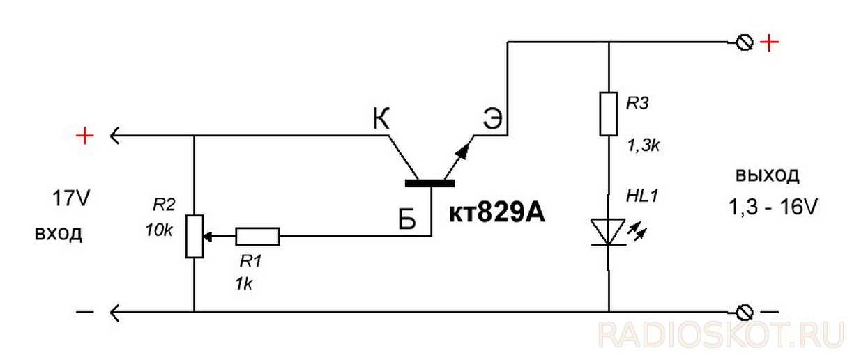 Имелся стабилизированный импульсный блок питания, дающий на выходе напряжение 17 вольт и ток 500 миллиампер. Требовалось периодическое изменение напряжения в пределе 11 – 13 вольт. И общеизвестная схема регулятора напряжения на одном транзисторе с этим прекрасно справлялась. От себя добавил к ней только светодиод индикации да ограничительный резистор. К слову, светодиод здесь это не только «светлячок» сигнализирующий о наличии выходного напряжения. При правильно подобранном номинале ограничительного резистора, даже небольшое изменение выходного напряжения отражается на яркости свечения светодиода, что даёт дополнительную информацию о его повышении или понижении. Напряжение на выходе можно было изменять от 1,3 до 16 вольт.