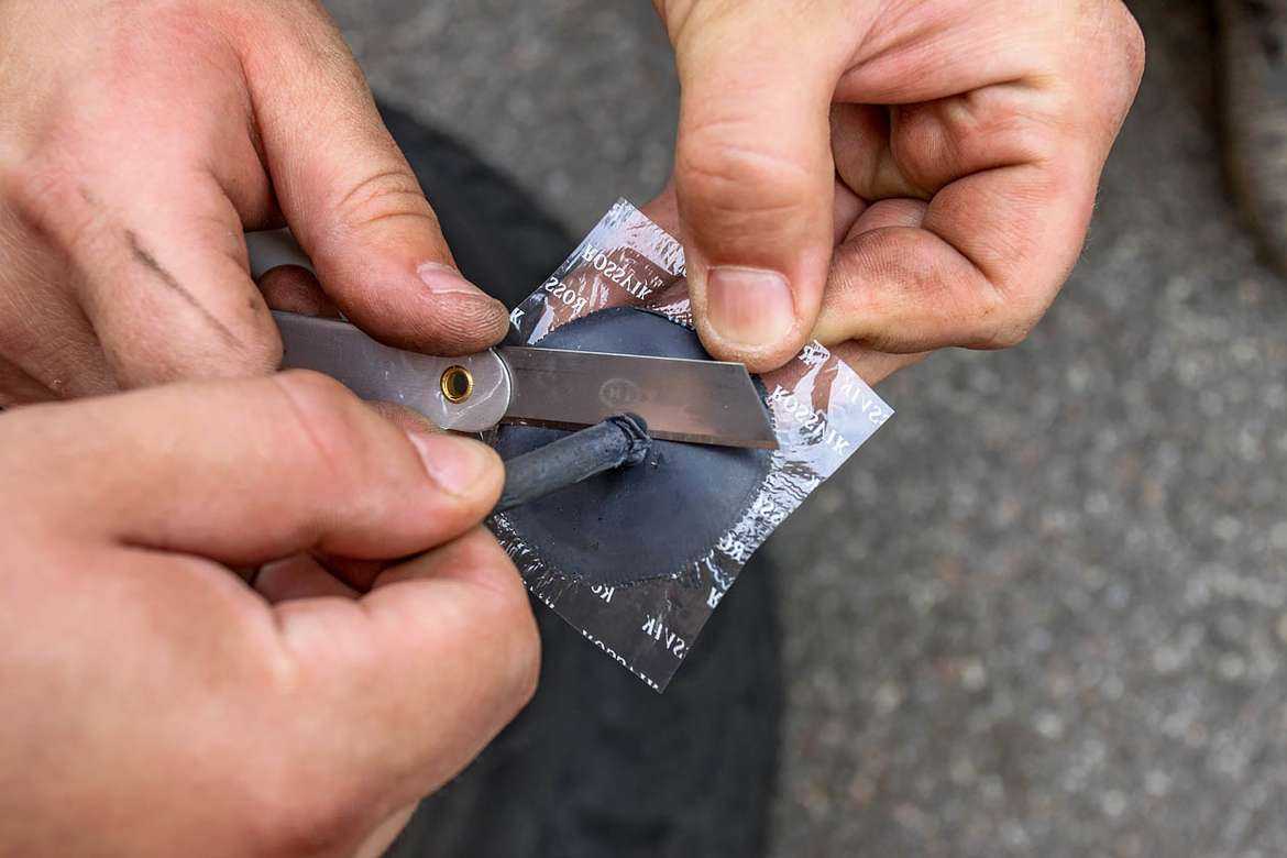 Проблема в том, что предназначена заплатка-«грибок», как и жгут, для немалой дырки в колесе. Толщина «ножки» такова, что протискивается она в отверстие диаметром не менее 3–4 мм, иначе резиновая оболочка «ножки» просто съезжает. Расковыривать прокол от гвоздя до такого размера нет смысла, а потому «ножку» можно срезать и приклеить только заплатку.