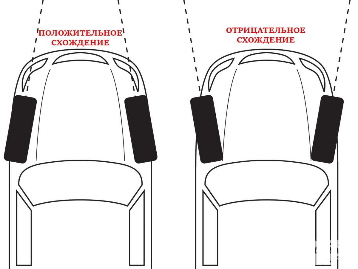 - Схождение – угол установки колес одной оси относительно друг друга в параллельной к дорожному полотну плоскости. Если проложенные условно через плоскости вращения колес оси пересекаются перед носовой частью, схождение считается положительным, а если позади кормовой части, то отрицательным;