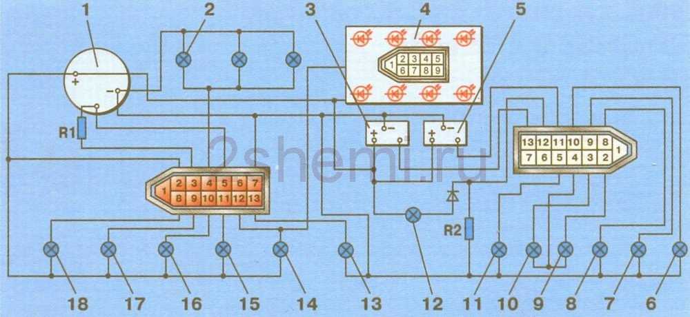 1 – тахометр; 2 – лампа освещения комбинации приборов; 3 – указатель температуры; 4 – блок управления БСК; 5 – указатель уровня топлива; 6 – контрольная лампа «CHECK ENGINE» для системы снижения токсичности; 7 – контрольная лампа дальнего света фар; 8 – контрольная лампа габаритного света; 9 – резервная контрольная лампа; 10 – контрольная лампа не пристегнутых ремней безопасности; 11 – контрольная лампа левых указателей поворота; 12 – контрольная лампа заряда аккумуляторной батареи; 13 – контрольная лампа правых указателей поворота; 14 – контрольная лампа аварийного давления масла; 15 – контрольная лампа резерва топлива; 16 – контрольная лампа воздушной заслонки карбюратора; 17 – контрольная лампа «CHECK ENGINE» для системы впрыска топлива; 18 – контрольная лампа стояночного тормоза; В1 – резистор 91 кОм; В2 – резистор 50 Ом, 5 Вт.