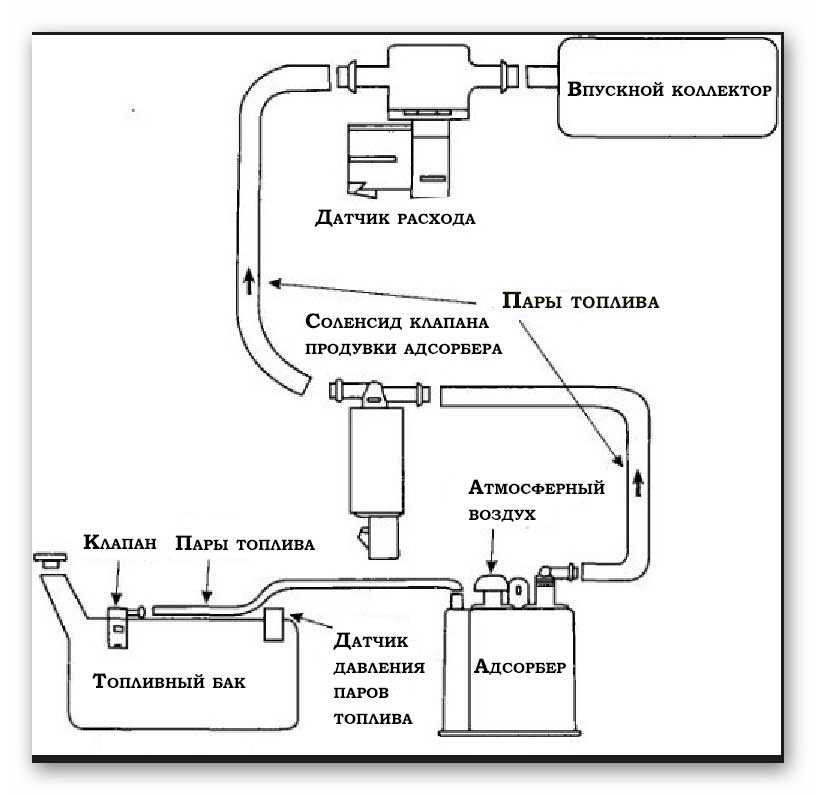 Пары бензина, через отдельно отводящий патрубок, поступают в адсорбер конденсируются там в виде топлива, которое возвращается снова в бак или во впускной коллектор. В первом случае процесс происходит при заглушенном двигателе, во втором – при работающем.