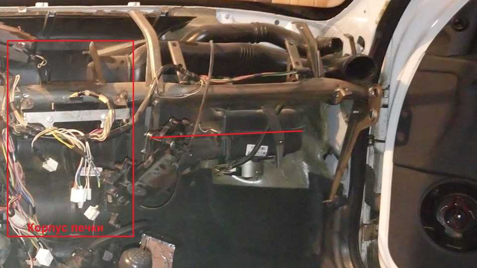Открутив гайку крепления и сняв патрубки подачи и отвода охлаждающей жидкости на систему отопления, переходим к демонтажу поврежденной детали в салон машины.