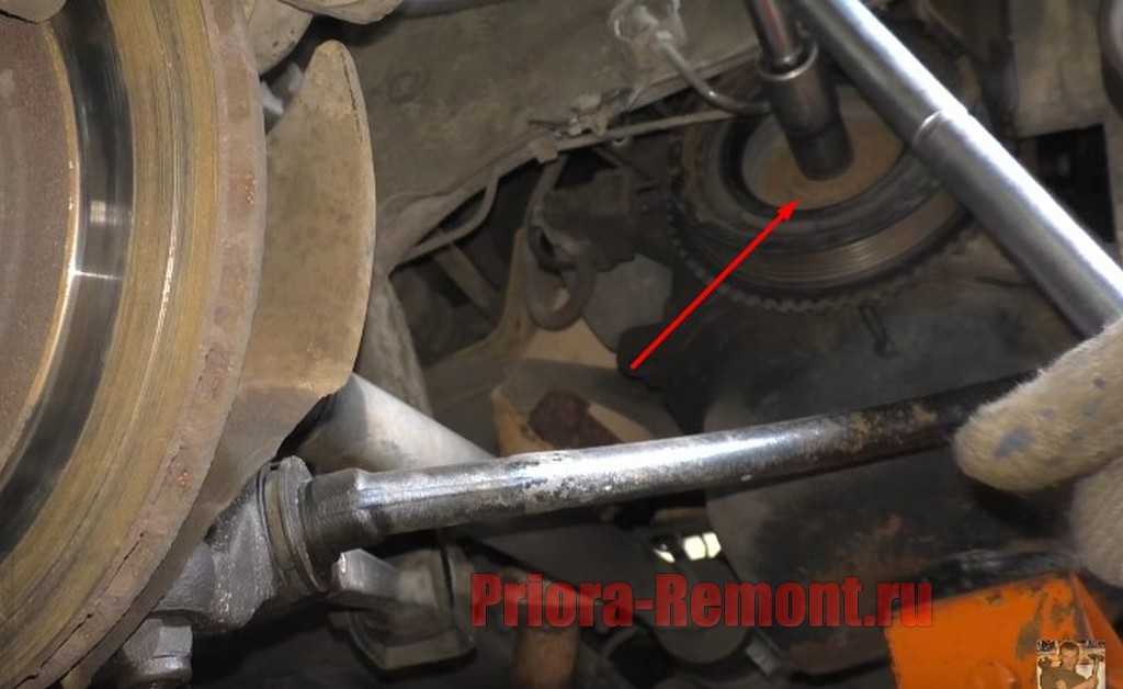 Для того, чтобы открутить шкив коленвала, можно воспользоваться пневмопистолетом либо воспользоваться помощью. Помощник, находясь в салоне, должен включить 5 передачу, нажать на тормоз и держать его. Далее необходимо рычагом открутить шкив коленвала.