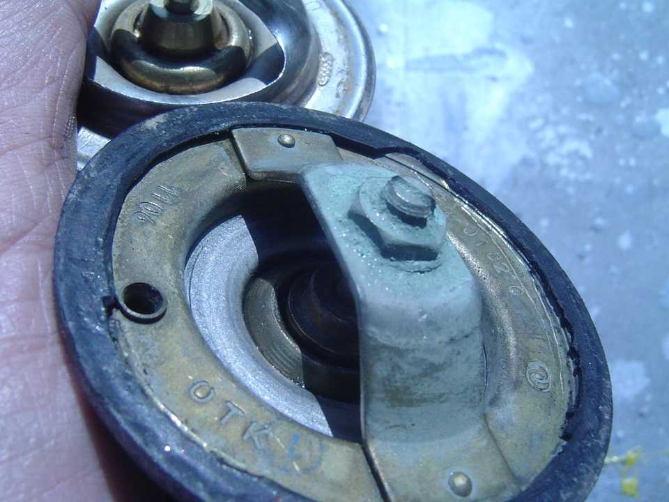 Обтачивал на точильном круге (точильном станке) – получилось быстро и аккуратно. Нижнюю тарелку подбирал от старых термостатов и выпрямлял, т.к. хотел чтобы расстояние между основным клапаном и нижней тарелкой было как на родном газелевском термике. Клапан для стравливания воздуха перевернул с помощью тисков – расплющенный хвостик зажимаем ребром в тисках и деформируем до нужной степени (чтоб проходил в отверстие), переворачиваем и расплющиваем обратно, чтобы держался. Резиновое колечко поставил от старого – оно плотно садится на обточенный диск. После заливки ОЖ и первого прогрева разница сразу заметна – температура стала 81-83 гр. Надо заметить, что уплотнительное колечко ставить нужно или новое, или с большим трудом загнать надетое оригинальное от tama в нижний корпус термостата (ведь оно больше по диаметру, чем посадочное место). Дело тут в уплотнении (герметичности), которое получается при стягивании двух корпусов. У tama основная тарелка практически плоская, тогда как у предназначенных для газели термостатов, она с высоким бортиком. Поэтому вместе с обычным тонким колечком стандартный термос создает герметичное соединение, а tama с таким же кольцом может и пропускать ОЖ наружу. Другой вариант – подложить половинку старого колечка под термос, тем самым приподняв его, или посадить соединение на герметик.