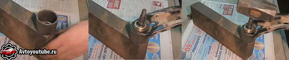 Переворачиваем рычаг, вставляем опору в свое гнездо. Чтобы запрессовать её обратно, нужно подобрать оправку подходящего диаметра. Бить по нижней части детали нельзя, разрушиться вкладыш. Можно воспользоваться накидной гайкой, чтобы её внутренний диаметр был по размеру упора шаровой. То есть, удар должен приходиться только на края новой детали.