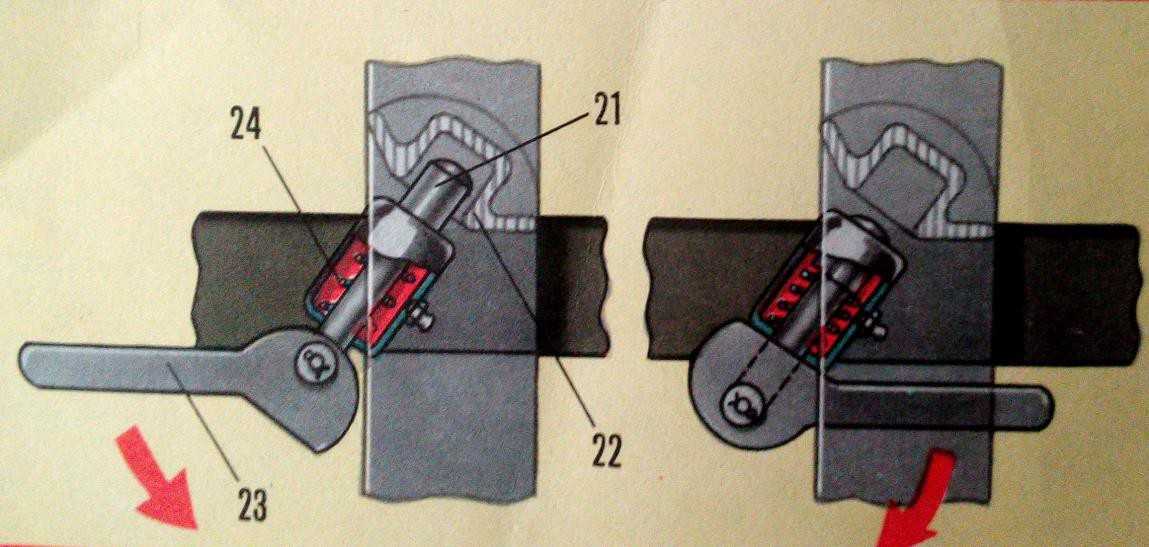 При движении задним ходом необходимо блокирование поворотной тележки относительно рамы прицепа. Для этого в конструкции тележки предусмотрено стопорное устройство (рис. 8 б). При блокировке поворотной тележки выпуклая поверхность рычага 23 давит на шток 21; при разблокировке – срез (лыска) рычага 23 освобождает шток 21, который под действием пружины 24 выходит из отверстия корпуса 22 стопора.