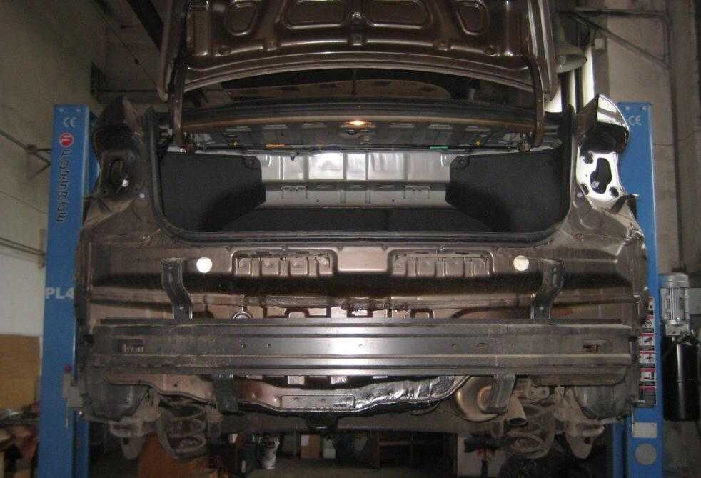 - Затем отверните болты крепления к кузову снизу. Открыв крышку багажника, отверните оставшиеся болты ключом «10».