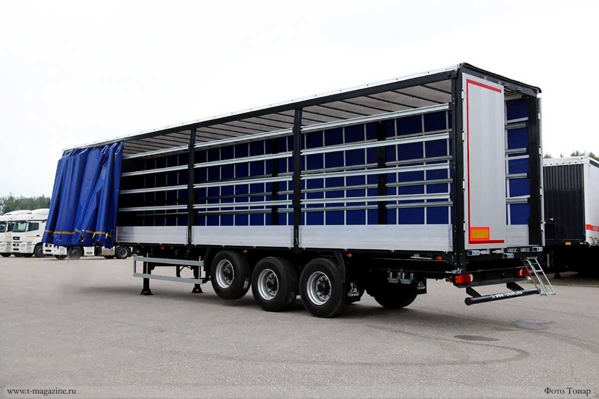 Для решения этих проблем используют шторный полуприцеп (шторка). Эта конструкция выглядит как платформа с тентом, состоящим из трех частей – крыши и двух боковин. Из-за отсутствия бортов, их роль выполняют боковые тенты. Они усилены стропой, что обеспечивает вертикальное натяжение. По горизонтали тенты натянуты специальной трещоткой.