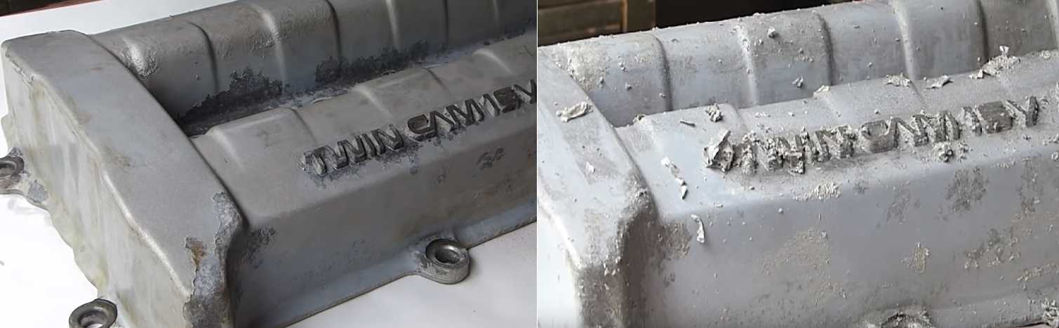 Клапанная крышка сделана из алюминия и покрыта защитным покрытием, которое может быть частично разрушенным. Его лучше снять смывкой для краски (см. статью про снятие краски, где подробно описано использование смывки). Распылите или намажьте смывку так, чтобы старое покрытие пропиталось. Дайте смывке минимум 10 минут, чтобы подействовать. Далее используйте проволочную щётку, чтобы удалить остатки покрытия. После удаления краски, обильно ополосните поверхность клапанной крышки водой и насухо протрите полотенцем. Очень важна подготовка к покраске. Любое пропущенное, плохо подготовленное место станет причиной отслоения краски. Кроме чистки нужно обработать поверхность красным скотч-брайтом.